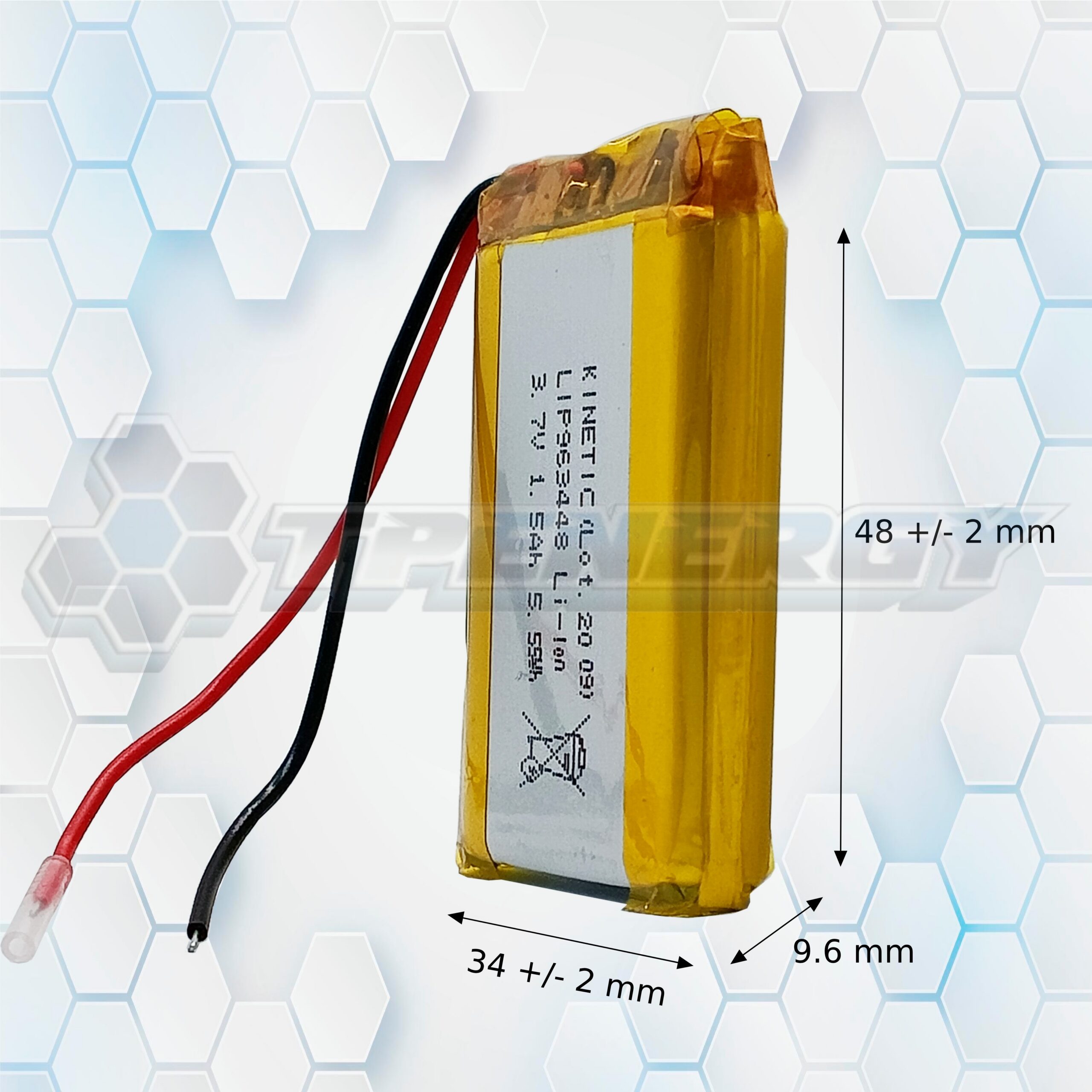 La celda de Litio Polímero Kinetic LIP963448 es una batería recargable de alta capacidad, diseñada para alimentar dispositivos electrónicos que requieren eficiencia energética y autonomía prolongada. Con una capacidad de 1500mAh y una energía de 5.55Wh, esta celda es ideal para sensores, sistemas portátiles, módulos inalámbricos y desarrollos tecnológicos avanzados.
