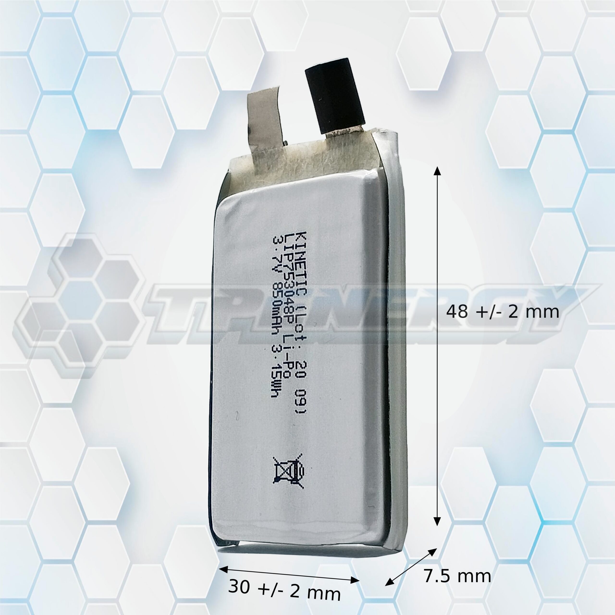 La celda de Litio Polímero Kinetic LIP753048P es una batería recargable de alto rendimiento, diseñada para alimentar dispositivos electrónicos que requieren eficiencia energética en un formato compacto. Con una capacidad de 850mAh y una energía de 3.15Wh, esta celda es ideal para sensores, módulos inalámbricos, sistemas IoT y desarrollos DIY.