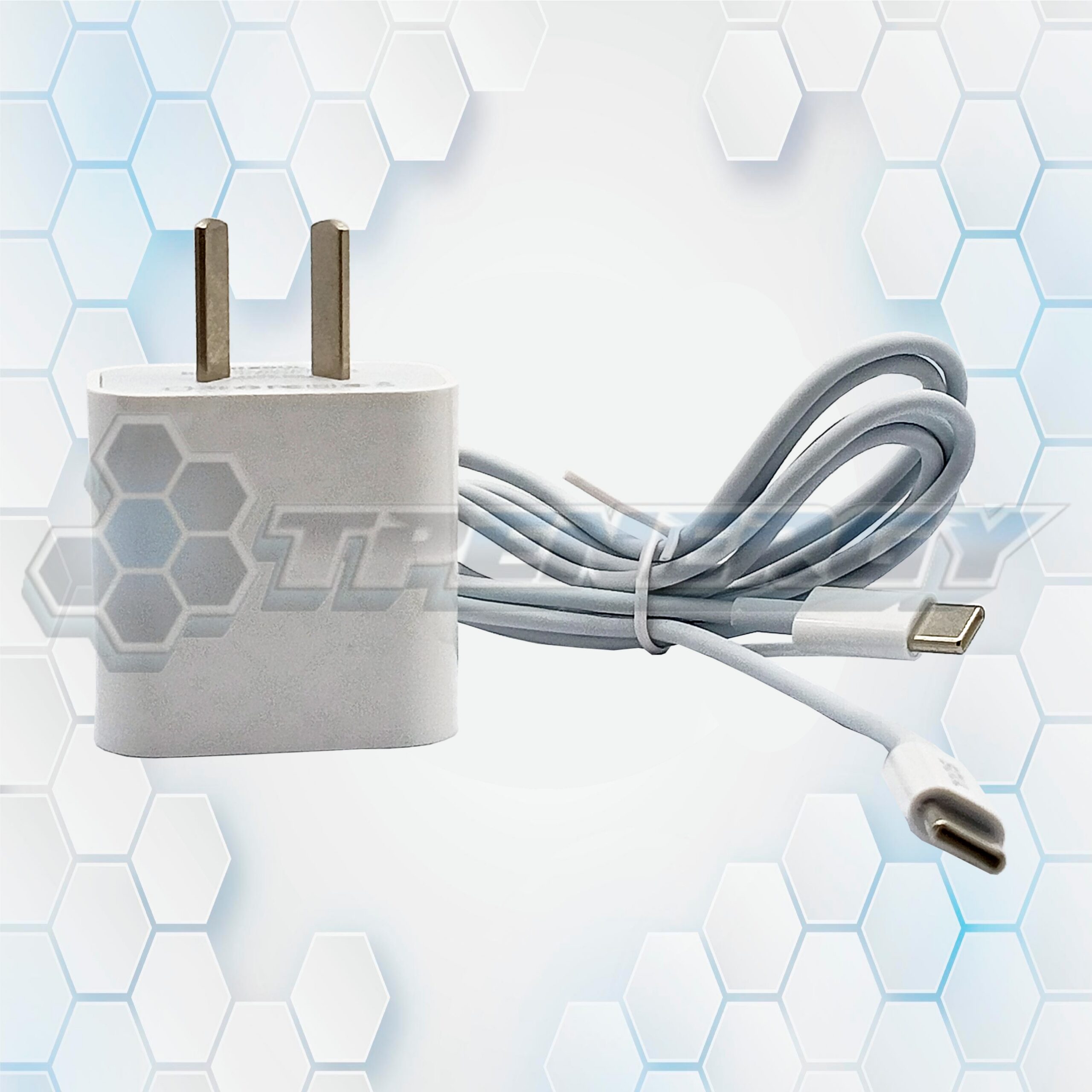 Cargador compacto de 20W con cable USB-C, ideal para viajes. Compatible con carga rápida Power Delivery.