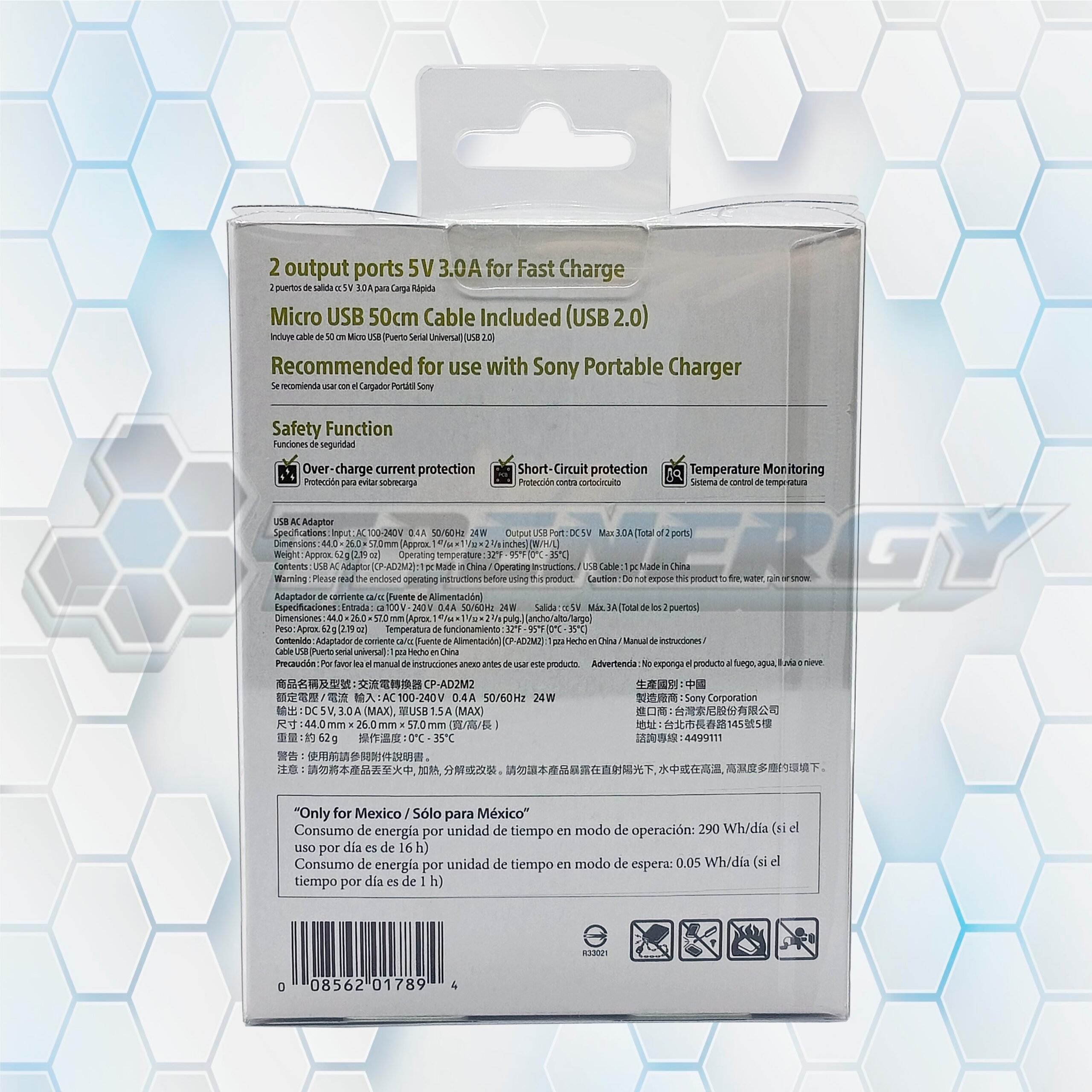 El Sony CP-AD2M2 es una fuente de alimentación de pared compacta y potente, ideal para cargar rápidamente tus dispositivos móviles. Con dos puertos USB tipo A y una salida total de 3.0A, permite cargar dos dispositivos simultáneamente, como smartphones, tablets, cámaras o cargadores portátiles.