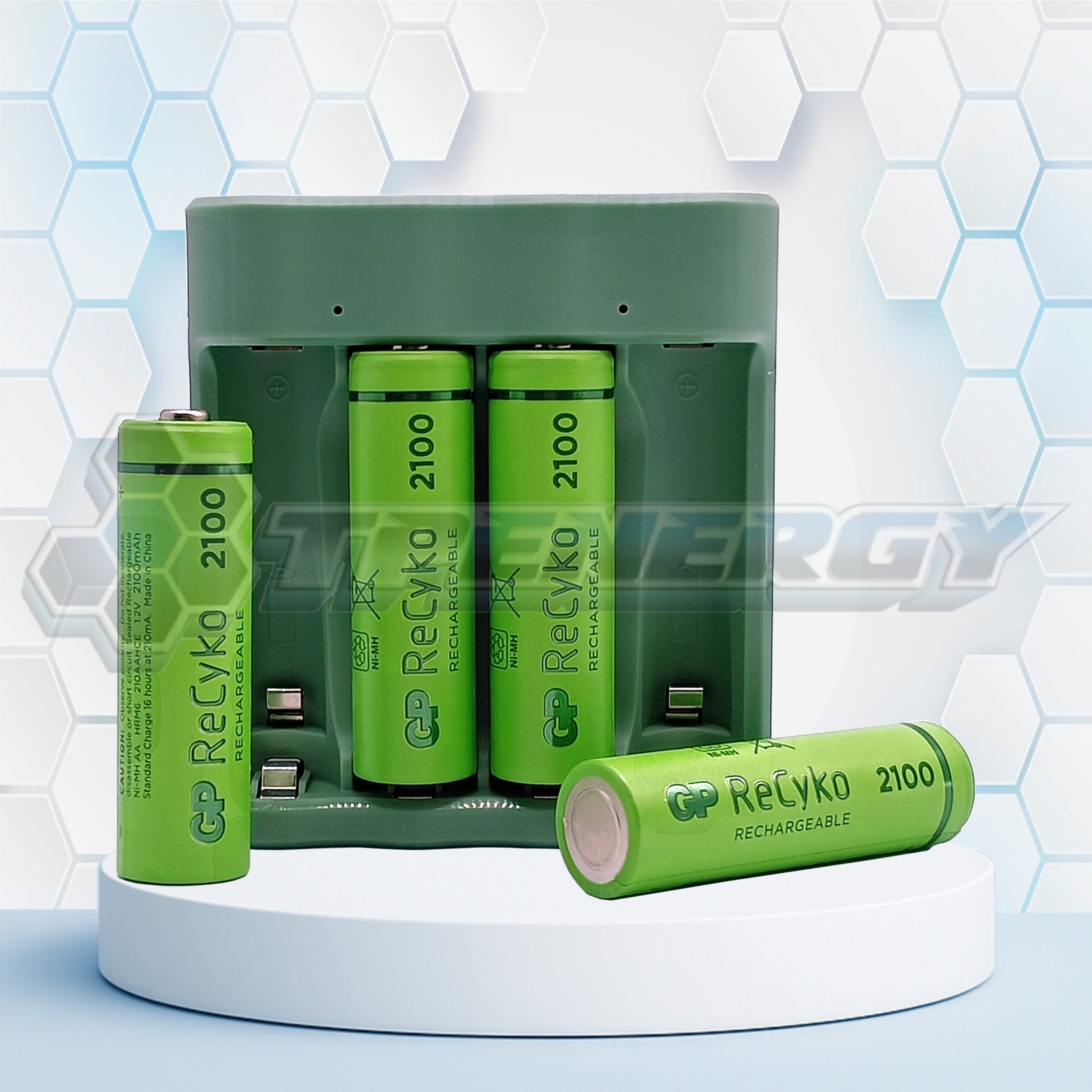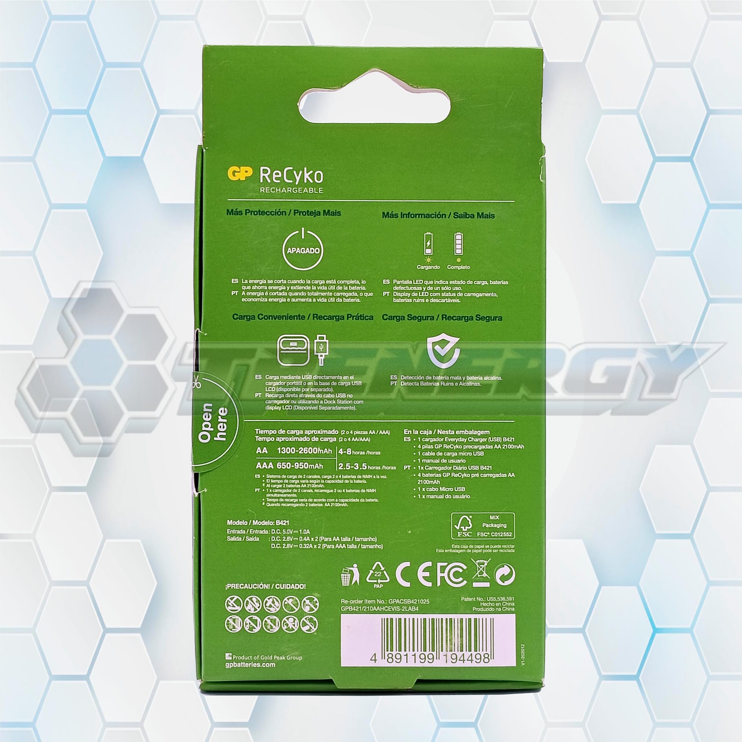 Funciona mediante conexión USB o con bases de carga GP ReCyko compatibles (modelos B421, M451 y P461), e incluye 4 pilas AA de 2100 mAh listas para usar.