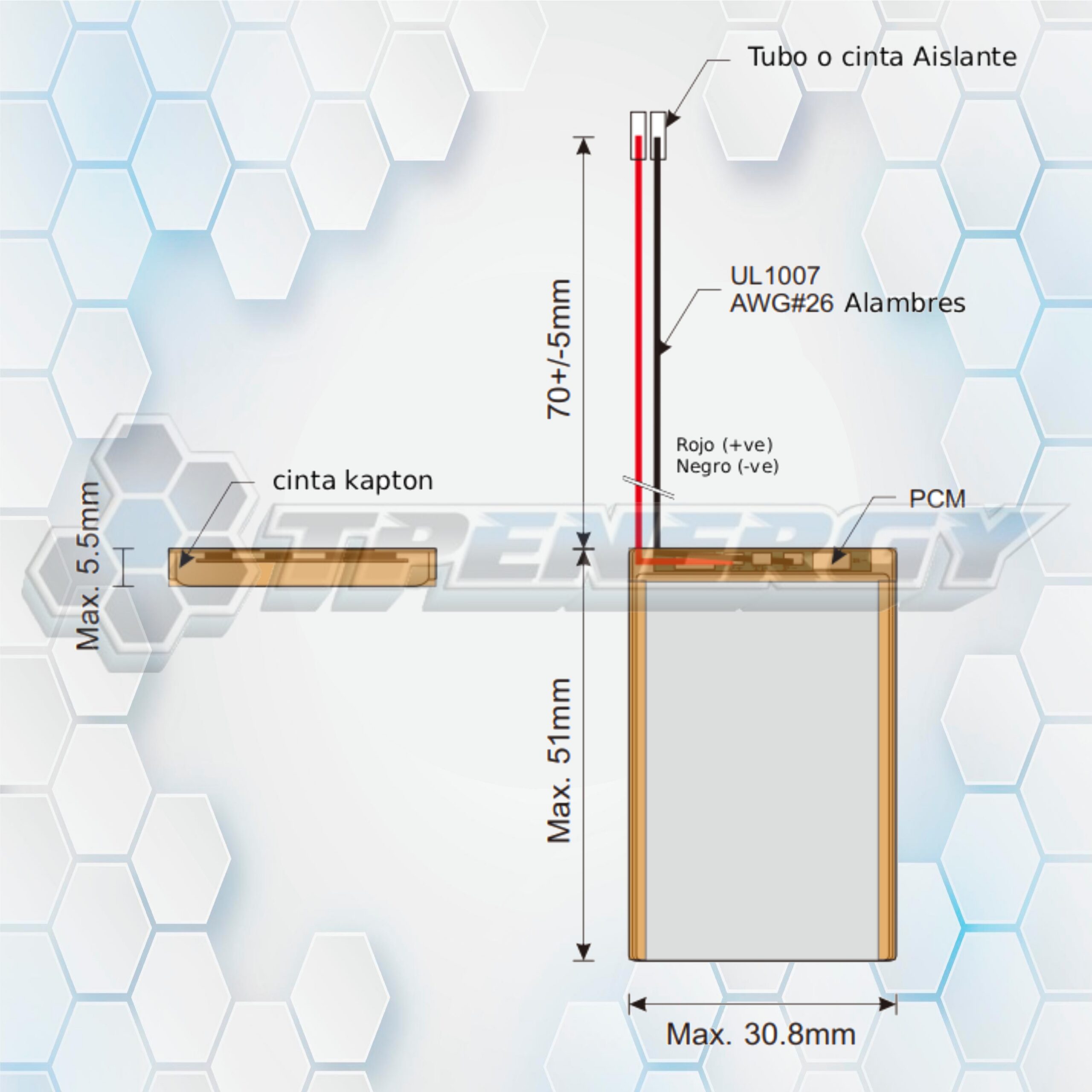 Cuenta con protección interna (PCM) contra sobrecarga, sobredescarga y cortocircuito, lo que garantiza seguridad en el uso. Su construcción liviana y delgada permite integrarla fácilmente en diseños compactos. Fabricada bajo estándares internacionales, es una opción confiable para desarrollos electrónicos exigentes.
