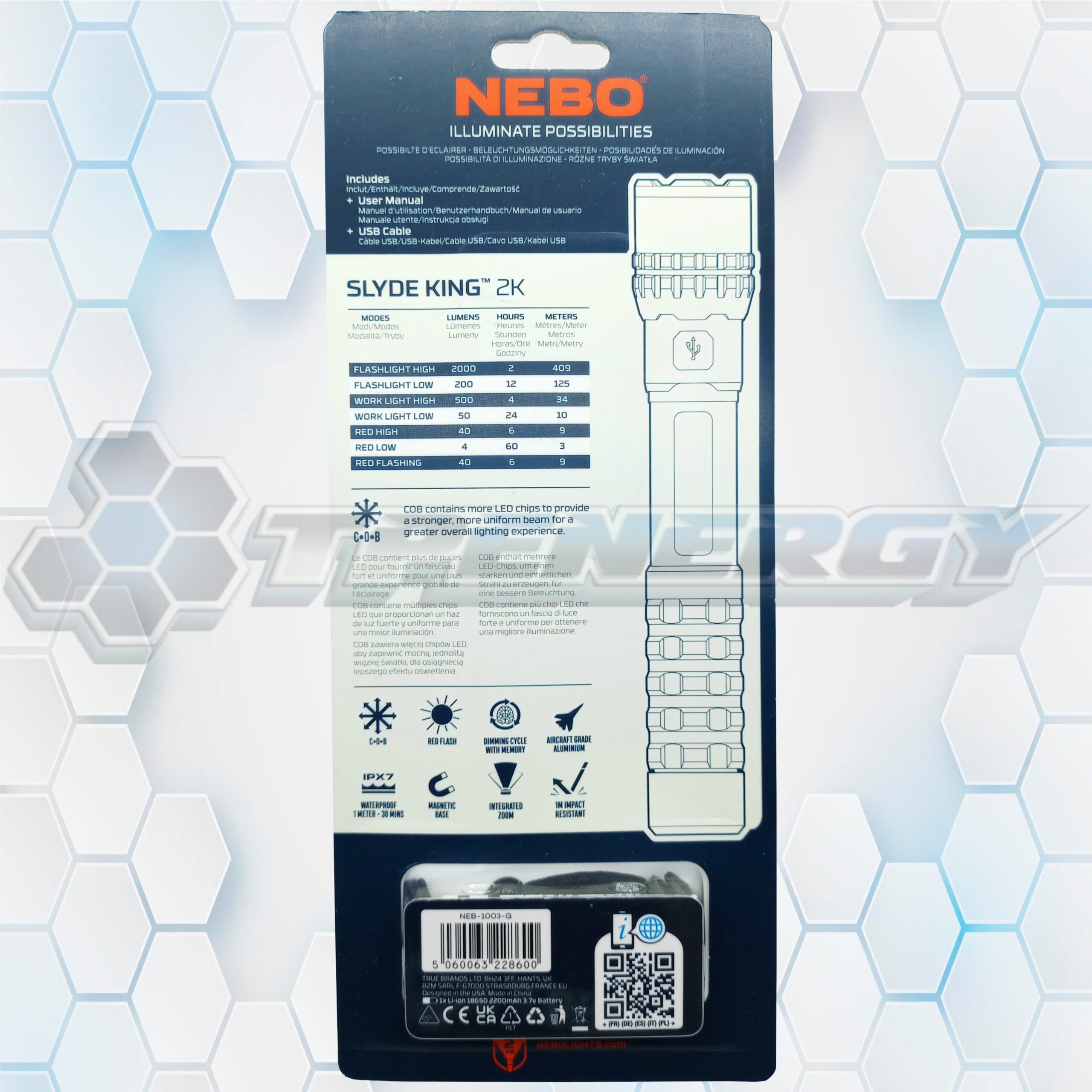 La Slyde King 2k es una linterna de 2,000 lúmenes, recargable, impermeable (IP67) y extremadamente versátil,  con zoom 4x y una luz de trabajo de 500 lúmenes C • O • B. Cada modo de luz es inmóvil con memoria programable. También cuenta con un agarre de goma ergonómico y una potente base magnética.