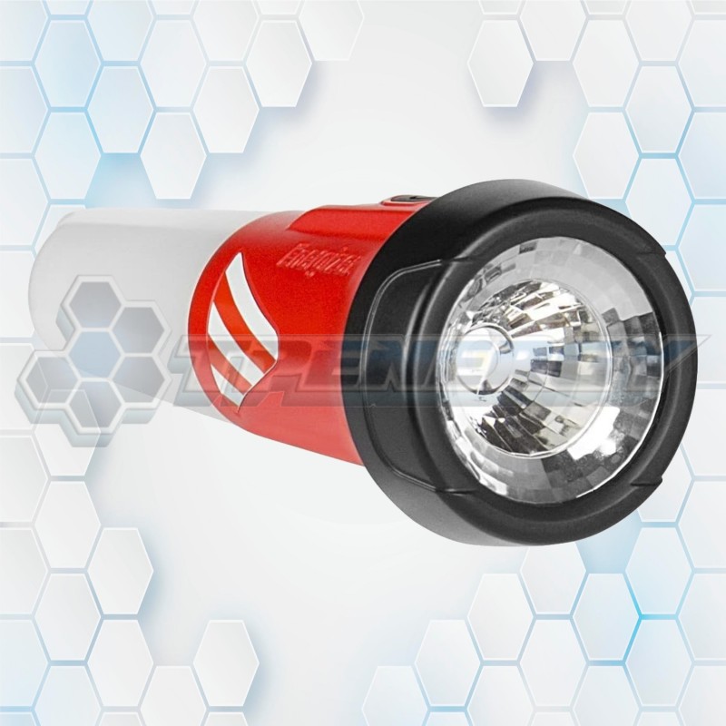 Con una potencia de 55 lúmenes, ofrece un alcance de hasta 50 metros y una autonomía aproximada de 35 horas, funcionando con 2 pilas AA alcalinas (incluidas). Su cuerpo de plástico resistente en colores rojo y blanco está diseñado para soportar el uso frecuente y condiciones de intemperie.