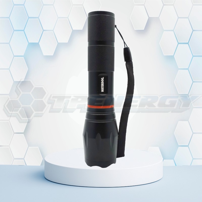 Linterna táctica recargable Waterdog de 1000 lúmenes con 5 modos de luz, zoom ajustable y cuerpo de aleación resistente. Ideal para camping, pesca o uso profesional.