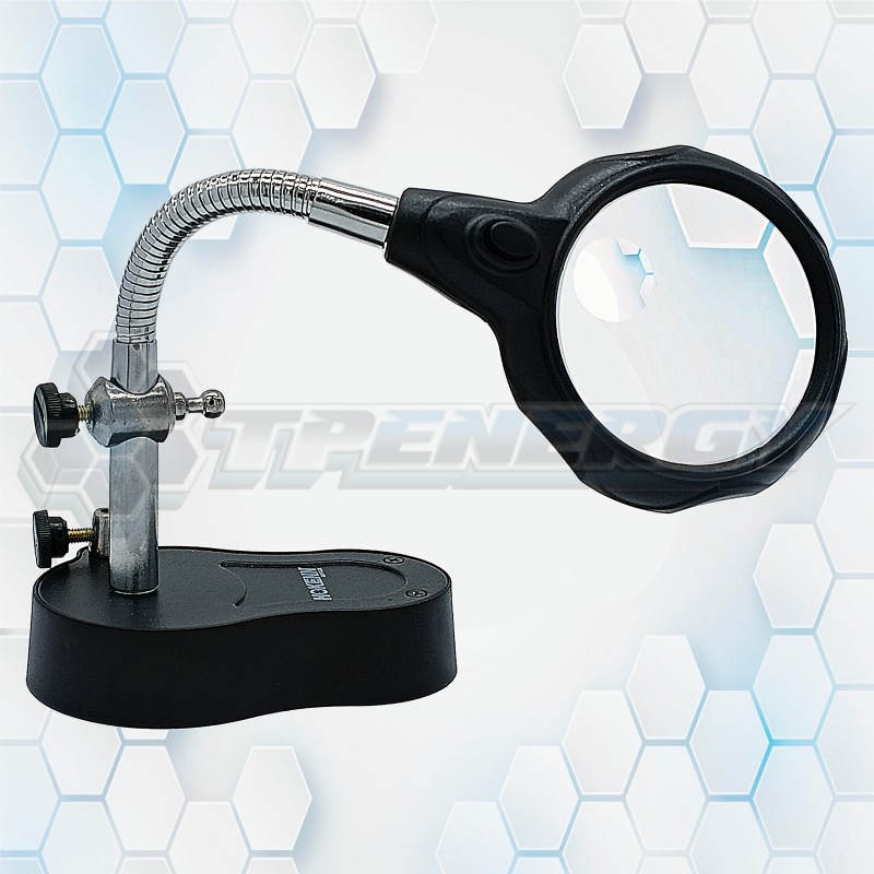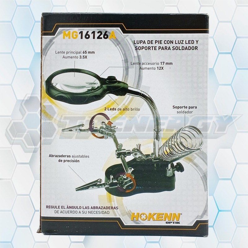 La lupa de pie HOKENN MG16126A está diseñada para brindar comodidad y precisión en tareas técnicas. Su lente mineral de 65 mm ofrece un aumento de 5X, garantizando una visión clara y detallada. Incorpora doble pinza ajustable para sujetar piezas y componentes, además de una base estable que permite trabajar sin sostener la lupa. Perfecta para electrónica, soldadura, modelismo y trabajos minuciosos.