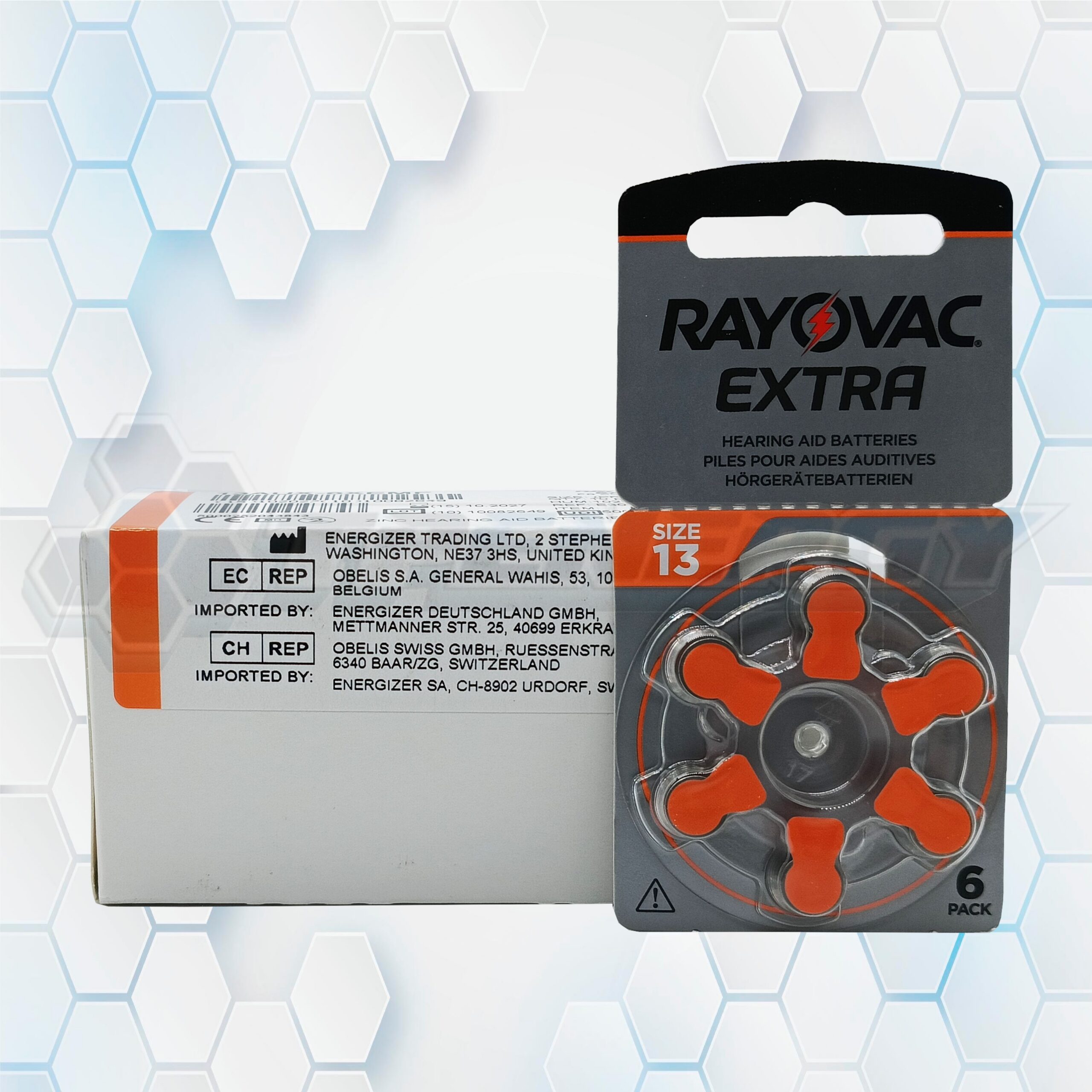 Pila Rayovac Extra AC13 Zinc-Air 1.45V, blister x6. Alta duración, libre de mercurio, ideal para audífonos BTE. Empaque seguro y pestañas largas. 13AUX-6XEMF