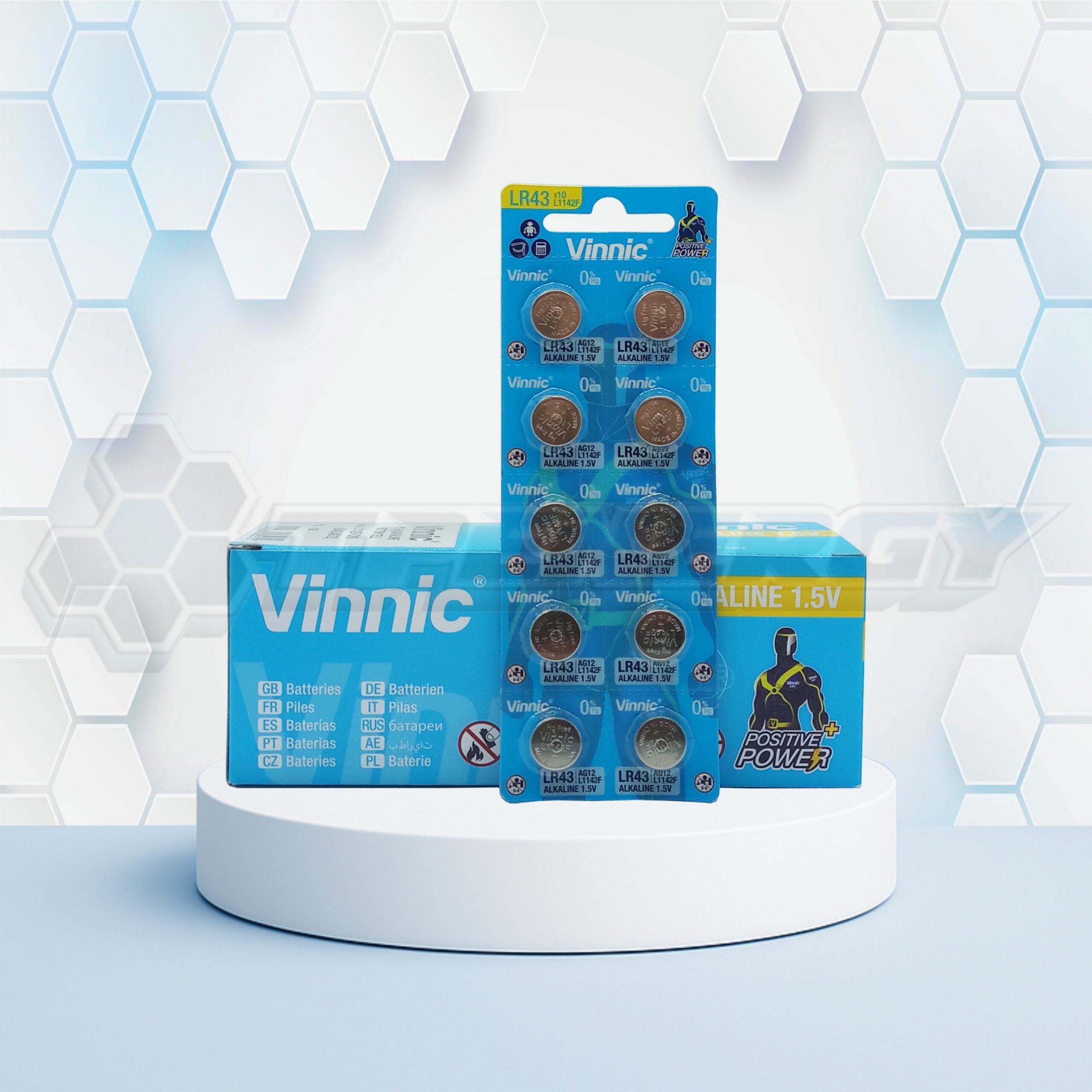 Pilas VINNIC LR44 1.5V alcalinas en blister por 10 unidades. Ideales para relojes, juguetes, controles, calculadoras y más.