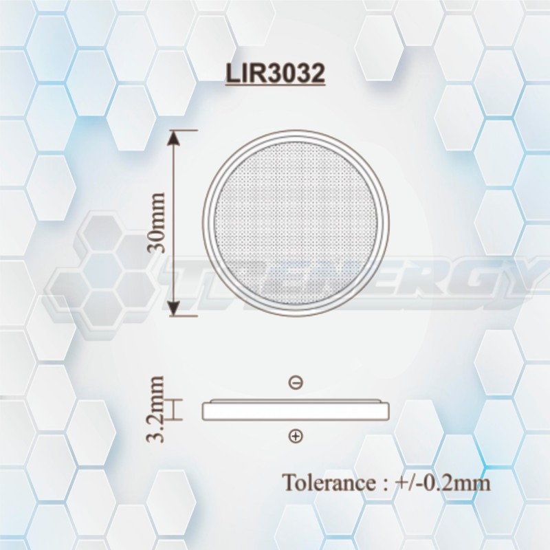 Modelo: LIR3032 Tipo: Batería de Ion de Litio Recargable (tipo moneda) Capacidad Nominal: 180 mAh (mínimo 170 mAh a 36 mA) Voltaje Nominal: 3.7 V Voltaje de Corte: 2.75 V Peso Aproximado: 7.1 g Ciclos de Vida: Más de 500 ciclos a 0.2C Corriente Máxima de Descarga: 180 mA Carga Estándar: CC a 36 mA hasta 4.2 V, luego CV hasta corriente < 9 mA Carga Rápida: CC a 170 mA hasta 4.2 V, luego CV hasta corriente < 9 mA Rango de Temperatura: