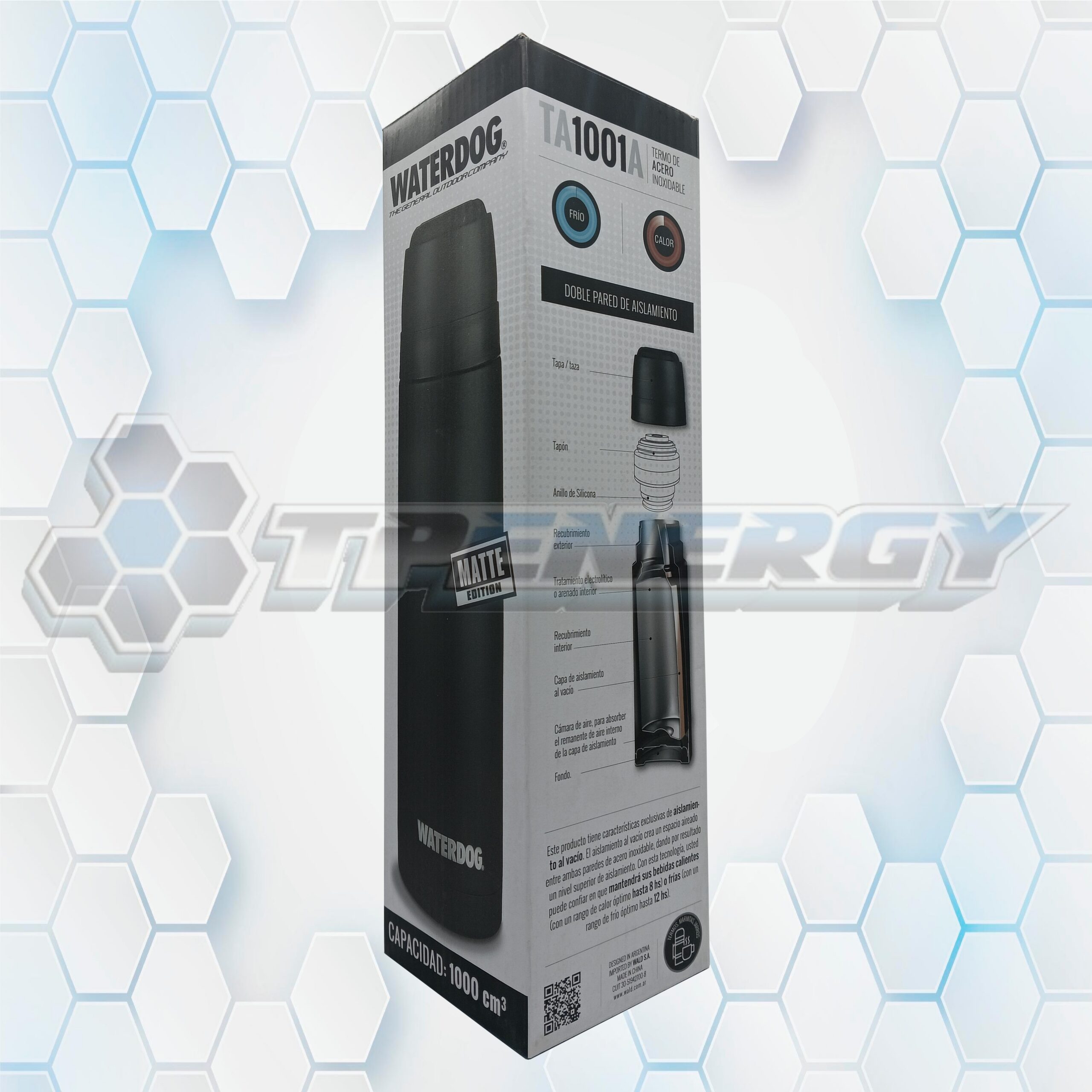 El Termo Waterdog TA1001A Matte Edition de 1 litro combina diseño moderno con máxima funcionalidad. Fabricado en acero inoxidable AISI 304, ofrece una excelente conservación térmica gracias a su doble pared con vacío, manteniendo bebidas calientes por hasta 8 horas y frías por 12.
